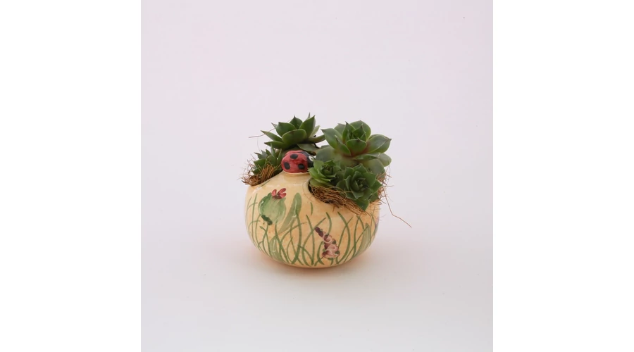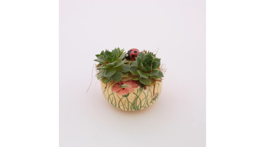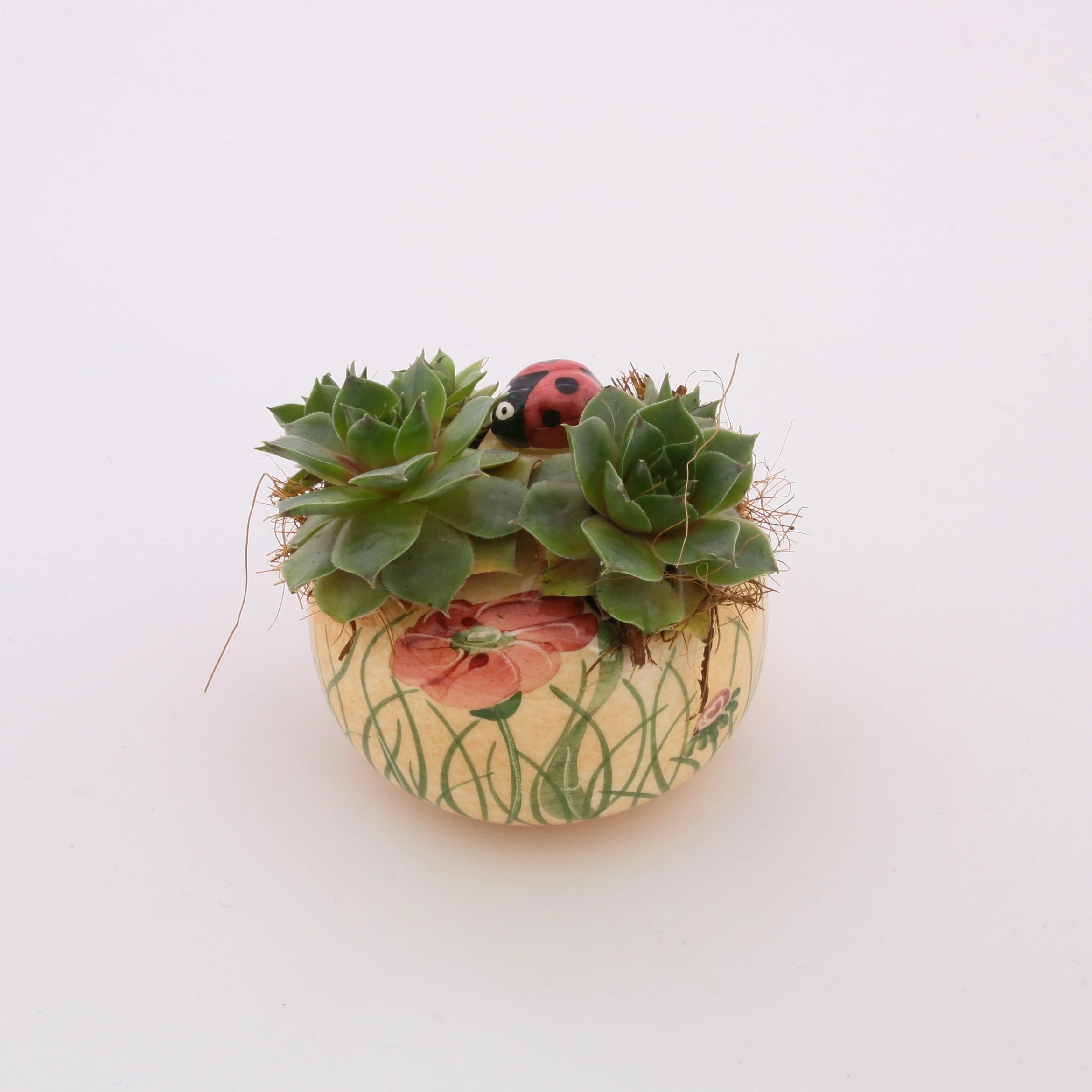 Újdonság műhelyünktől! Kisméretű asztali virágtartó, kerámia, kézzel festett pipacsos mintával, katicás rátéttel, átmérője 8 cm. A virág illusztráció, nem része a terméknek. Beltéri, kültéri használatra is. Kisméretű sziklakerti növényeket ültetését javasoljuk. |